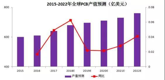根據Prismark 預測,未來幾年,全球PCB 電路板行業產值將保持持續增長態勢,到2022 年,全球PCB 電路板行業產值將達到近760 億美元。而從全球范圍看,中國近幾年PCB行業發展迅速,預計到2019年,中國的PCB產值有望達336 億美元,2014-2019年的復合增速約為5.1%,比全球增速高出2個百分點。伴隨著全球PCB產業的轉移,我國有望在全球角逐中逐漸奪得PCB行業的主導地位。