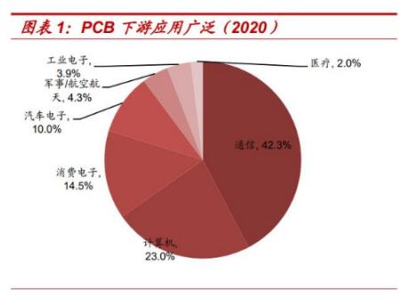PCB是承載電子元器件并連接電路的橋梁,廣泛應(yīng)用于通信、消費(fèi)電子、計(jì)算機(jī)、汽車(chē)電子、工業(yè)控制、軍事/航空航天、醫(yī)療器械等領(lǐng)域。PCB在汽車(chē)電子中主要應(yīng)用于動(dòng)力控制系統(tǒng)、安全控制系統(tǒng)、車(chē)身電子系統(tǒng)、娛樂(lè)通訊四大系統(tǒng),主要有車(chē)燈總成、液晶儀表、空調(diào)器、車(chē)身傳感器等電子電器零部件。