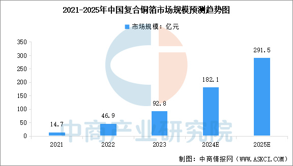 當前復合銅箔已進入材料認證、裝車試驗關鍵節點,有望實現復合銅箔規模化應用0到1的突破。中商產業研究院發布的《2025-2030年中國復合銅箔產業前景預測與戰略投資機會洞察報告》顯示,2022年中國復合銅箔市場規模達到46.9億元,2023年達到約92.8億元。中商產業研究院分析師預測,2024年中國復合銅箔市場規模將達到182.1億元,2025年達到291.5億元。