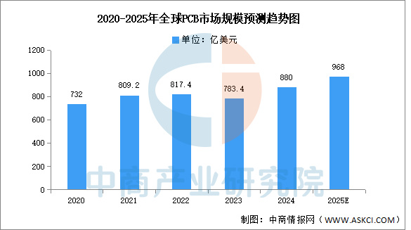 中商產業研究院發布的《2025-2030年中國印制電路板(PCB)行業發展趨勢及預測報告》顯示,2023年全球PCB市場規模為783.4億美元,同比下降4.2%,2024年約為880億美元。隨著AI技術的普及和新能源車的搶市,AI服務器和車用電子相關的PCB需求顯著提升,成為產業成長的重要驅動力。中商產業研究院分析師預測,2025年全球PCB市場規模將達到968億美元。