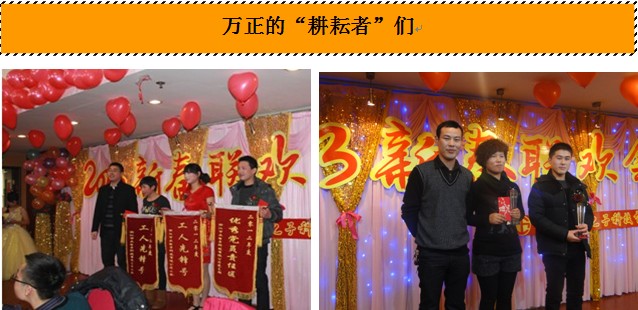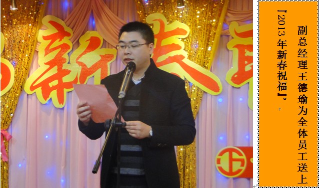 16:20,一場屬于萬正人的2013年新春聯歡會正式拉開序幕。主持人沈曉麗、鄧健的亮相之后,現場的氣氛愈加熱烈。本次新春聯歡會共分為四個環節,即領導賀詞、年度表彰、幸運抽獎、新春年夜飯。首先,副總經理王德瑜為全體萬正人送上了新一年的賀詞。他一再強調,正是全體萬正人團結協作、積極進取的優良傳統和鍥而不舍的拼搏精神使公司迎難而上,勇克困難,為2012工作劃上了圓滿句號。同時,他指出,2013年公司將以“加快管理提升,提高質量效益”為目標,要在管理提升、績效執行、持續改進、建好隊伍四個方面實現新的飛躍。王總振奮人心的賀詞讓大家內心澎湃,士氣大振。現場的喝彩聲、掌聲絡繹不絕。