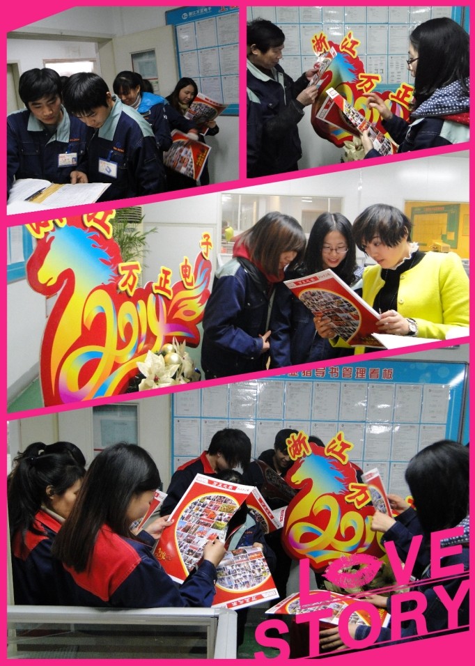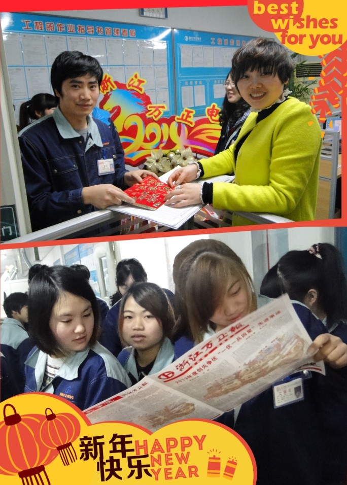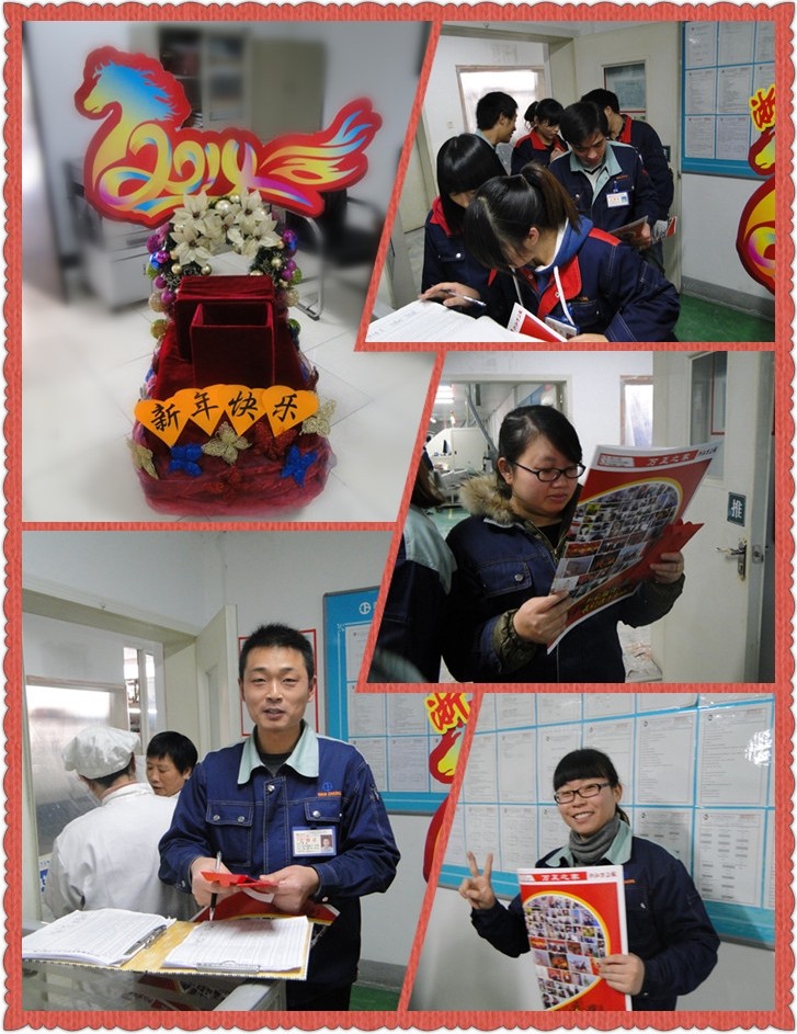 二零一四年一月十六日下午一點整,一輛花朵盛開、彩蝶飛舞的“馬年”小推車緩緩地推入了公司的車間,它散發(fā)著新春惹人愉悅的氣息,裝載著公司對全體員工們深深的新年祝福。這是萬正公司給員工現(xiàn)場送紅包了!喜聞喜訊的員工們帶著微笑,踏著輕快的步伐,紛紛前來領取新年紅包。今年正值公司成立十周年,因此除了新年紅包,公司更給員工們發(fā)放了工齡獎紅包,以感謝為公司十年發(fā)展作出貢獻的員工們!大家感受著公司祝福,愉悅的心情溢于言表。同時,公司為員工們送上新年特刊---《浙江萬正報》,看著大家宣讀著2013年度公司“一優(yōu)一兵四星”的先進事跡,看著他們在“萬正之家”中尋找自己的笑臉而不時露出的微笑,身在其中的我不得不被這其樂融融的氛圍所感染。