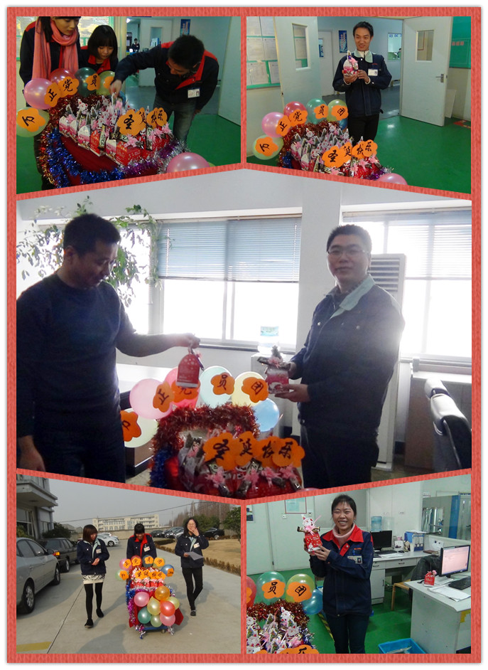 這是浙江萬正電子科技有限公司團委正在給全體團員、黨員派送圣誕小禮物:平安果和巧克力——預祝大家生活平平安安、甜甜蜜蜜。一個個紅色的或粉色的小禮盒,讓大家滿心歡喜。手拿一個個小禮盒,團員、黨員都露出了喜悅的笑容。